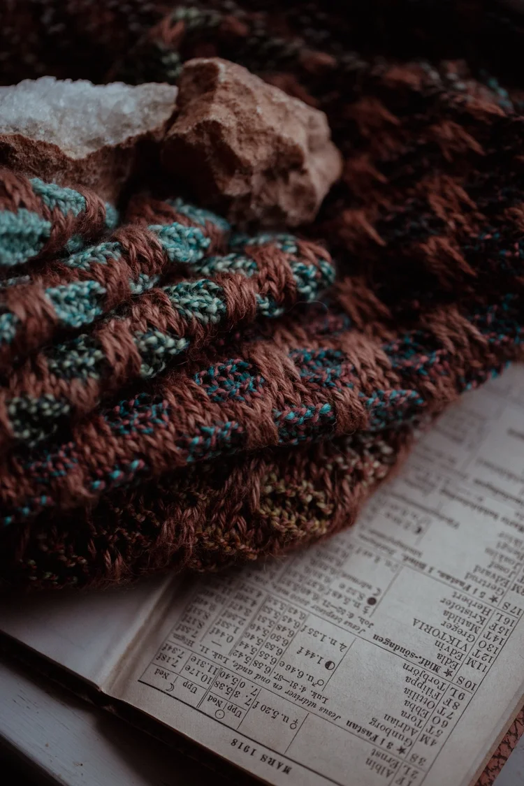 Och nu när solen börjar gå upp till en gråmulen decemberdag här i skogen lämnar jag er med en liten smygtitt på en sjal jag stickat till min man i julklapp - en härva Dyed in the Wool i den perfekta färgen Something Wicked, tillsammans med en härva Sägen Fe i färgen Kvast - för att sopa ut det gamla och göra plats för det nya. Under den ligger en almanacka från 1920-talet, en påminnelse om att tiden är... underlig, förunderlig. Så ta ett djupt andetag, sticka ett varv till, och låt saker och ting få vila en stund. Ett nytt år kommer, men ännu är det midvinter.