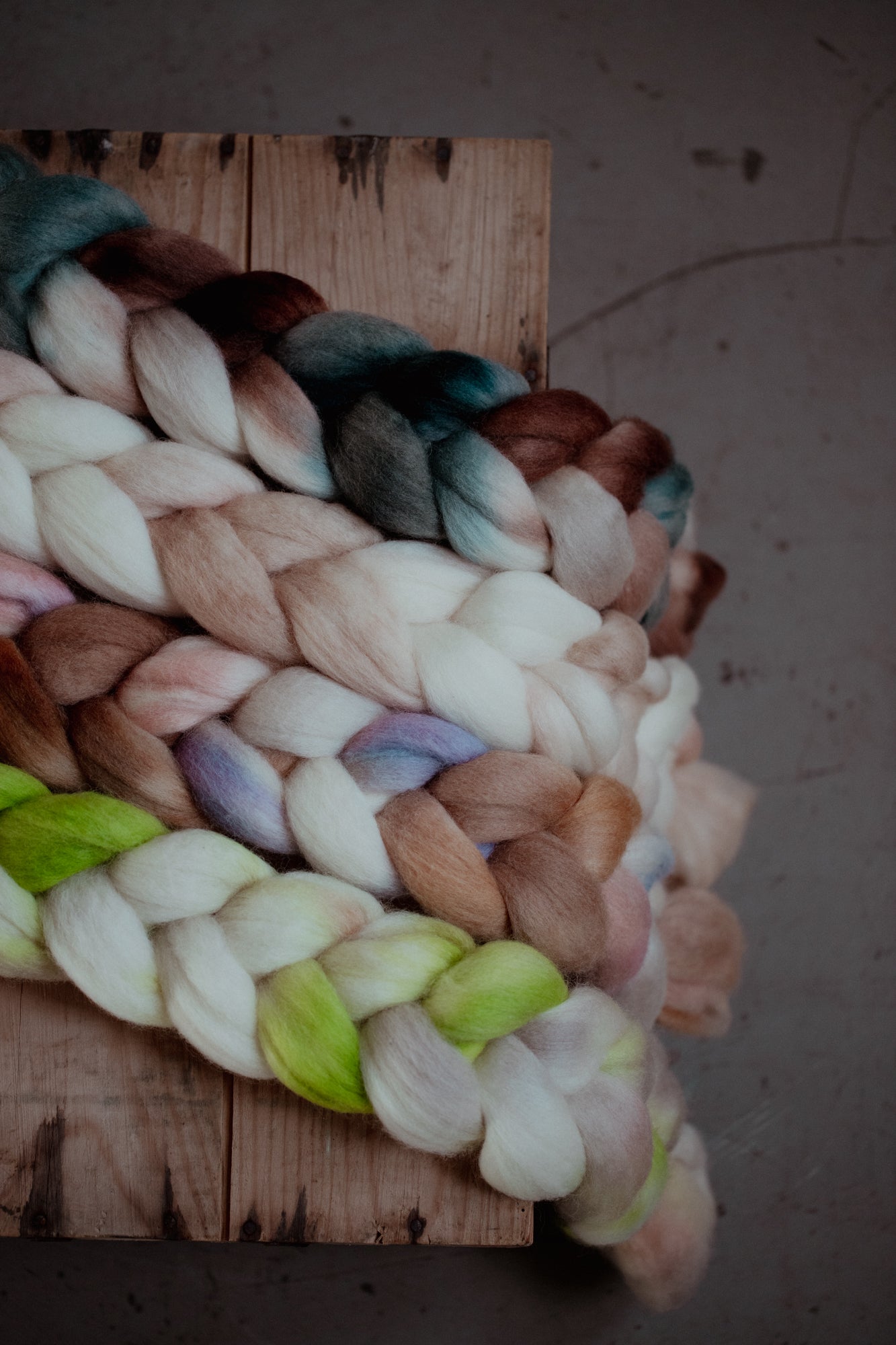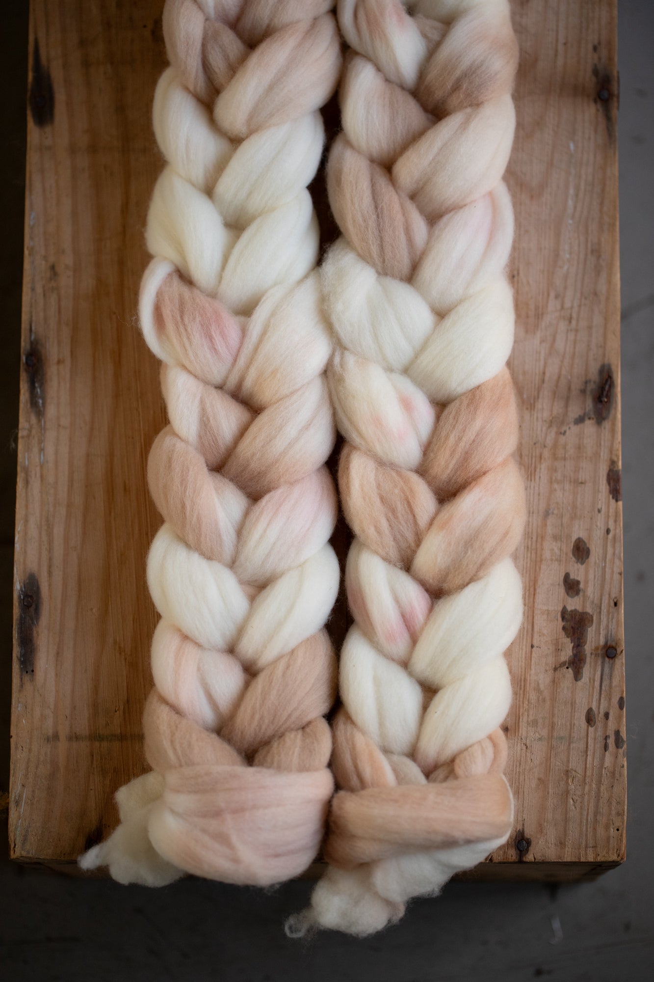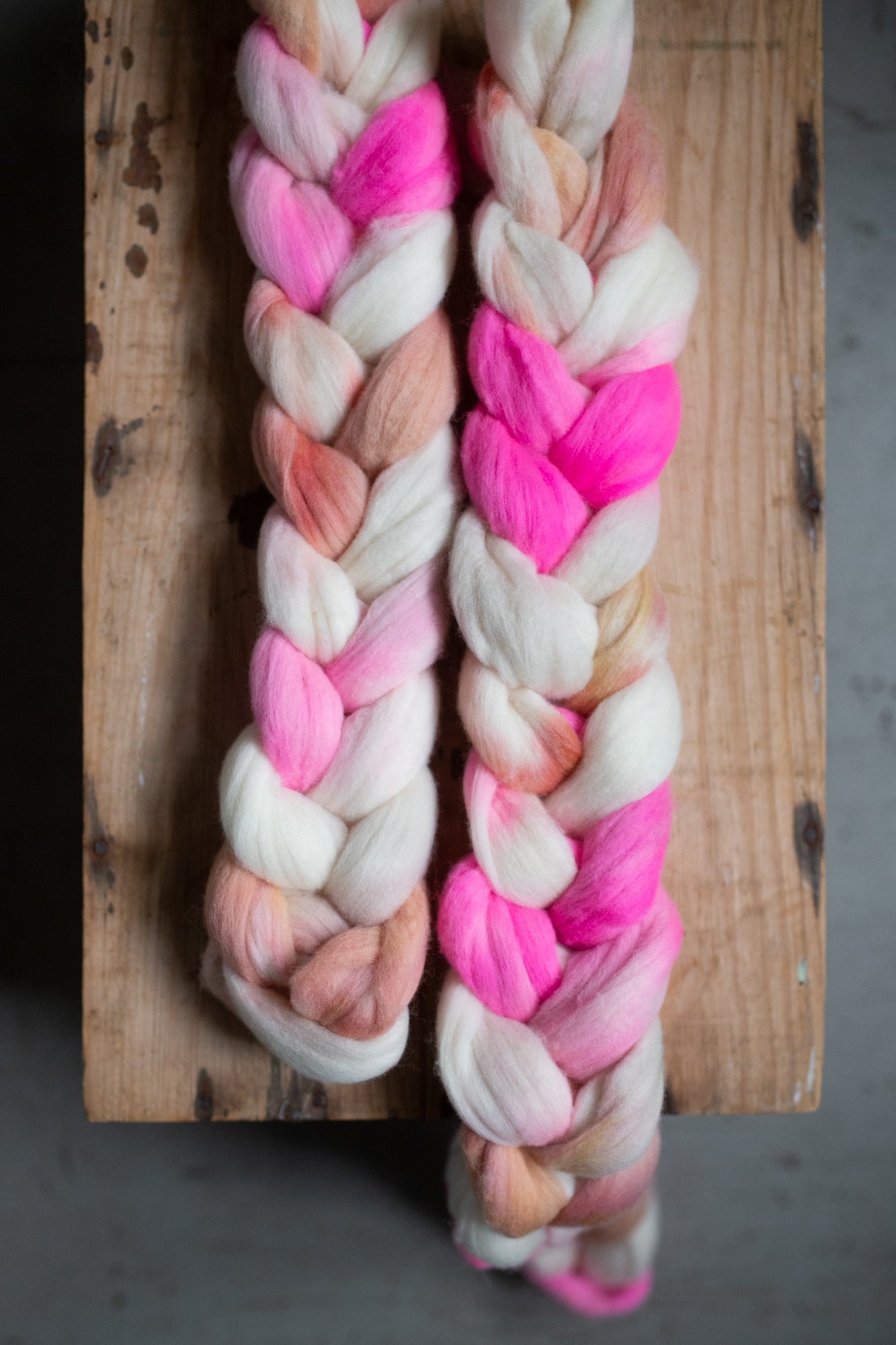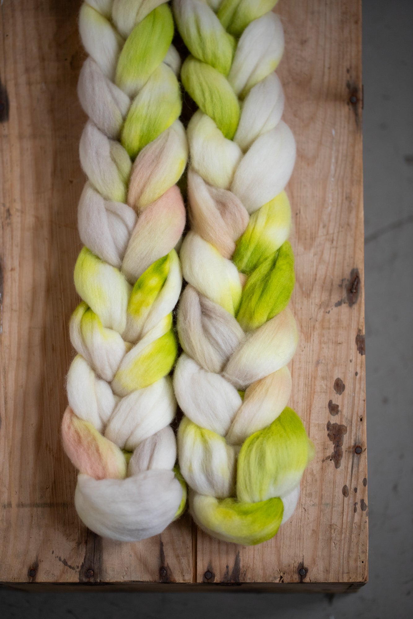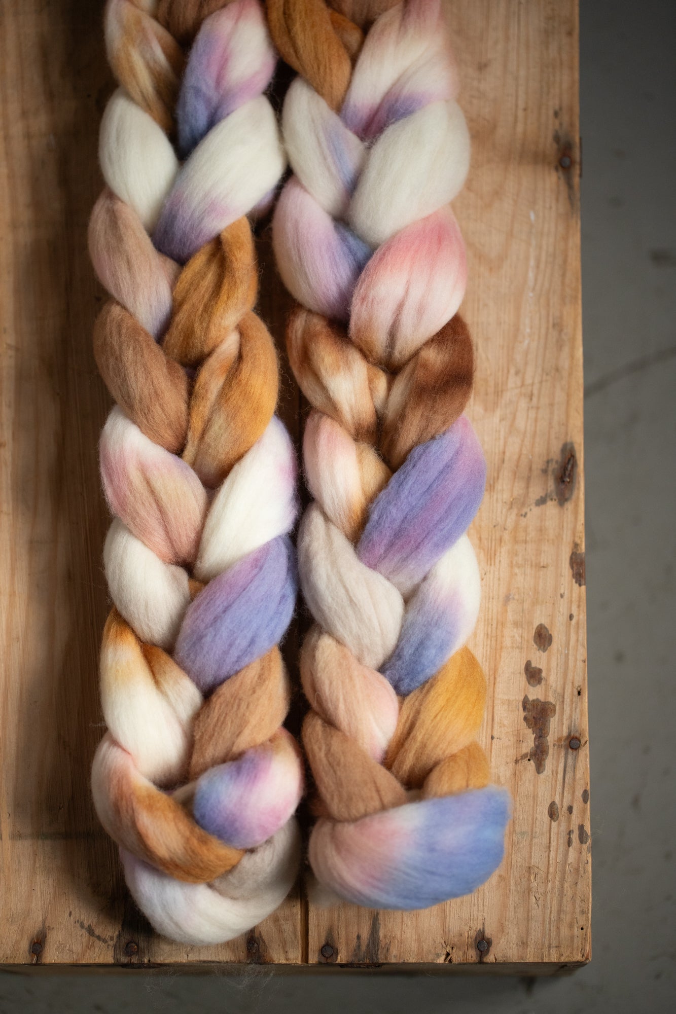 - Colour section spin: Tear the braid apart where the colours change, and spin one colour at a time. You can then make a 2- or 3-ply yarn where the strands have different colours but still match, creating a marled effect.