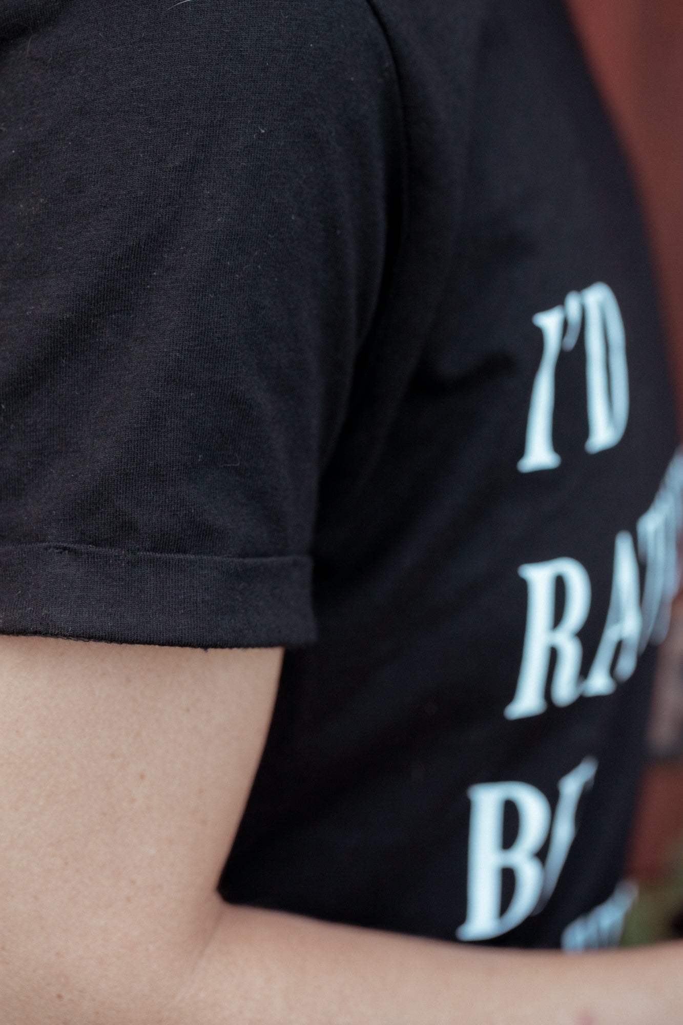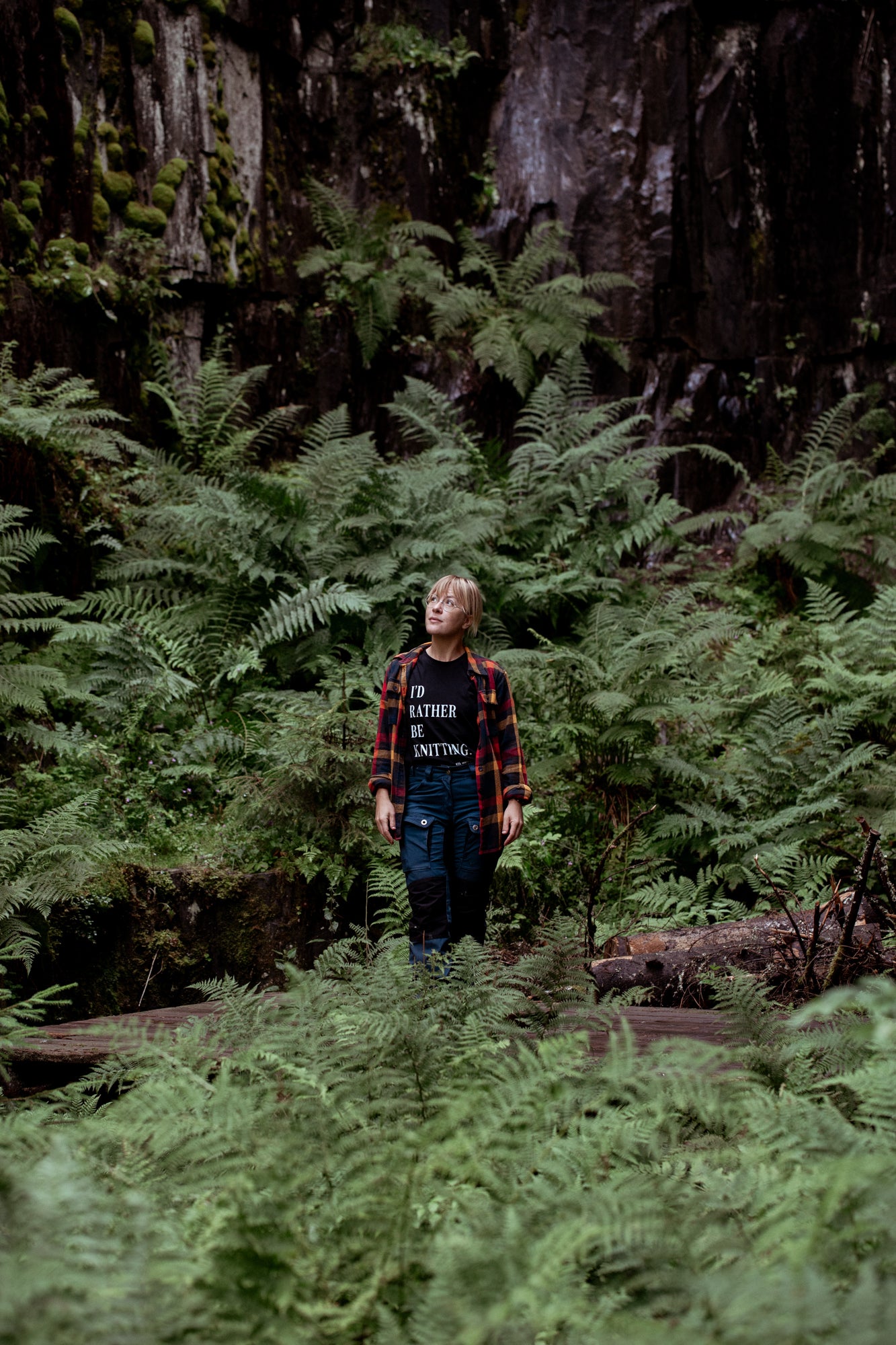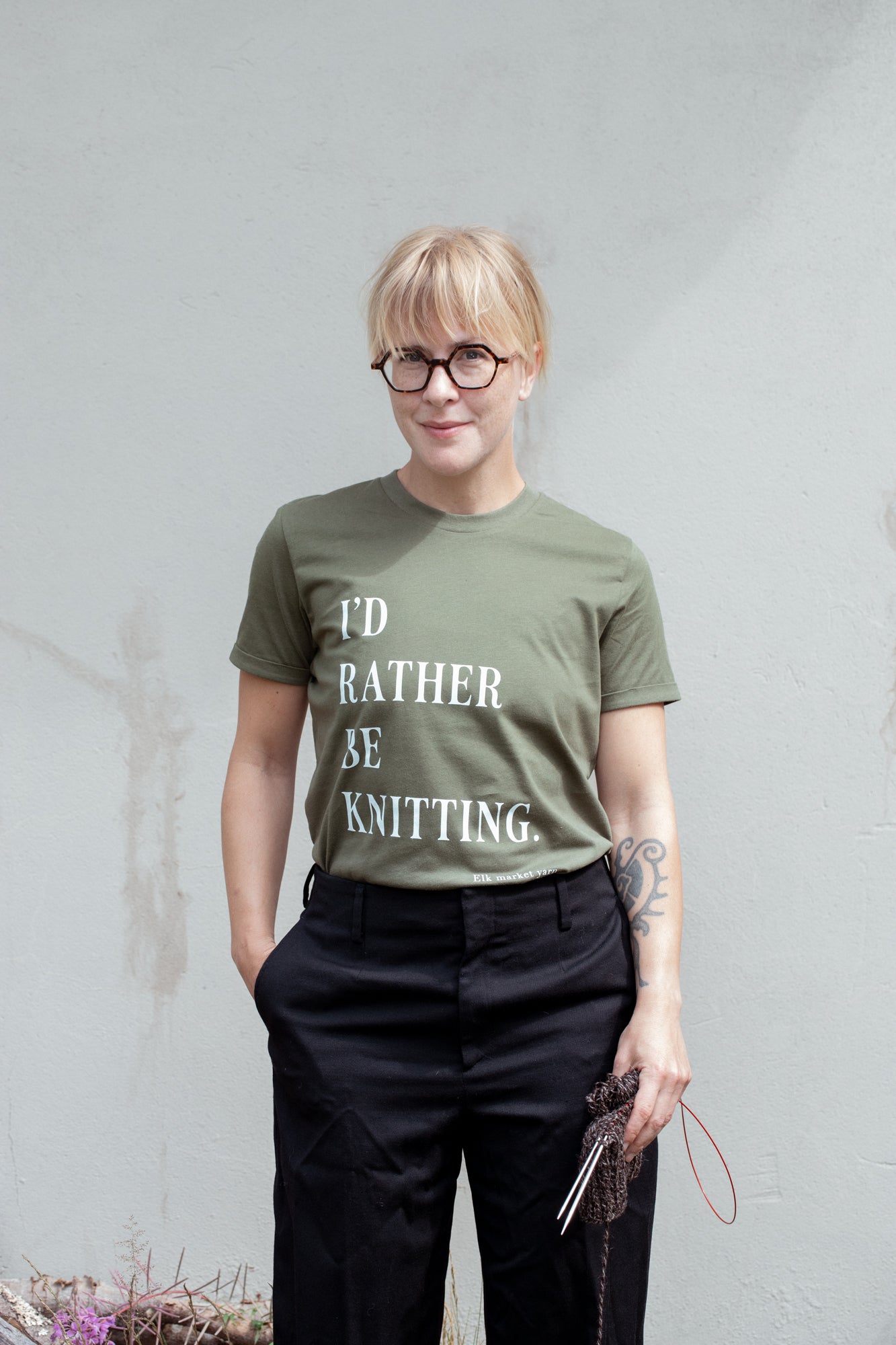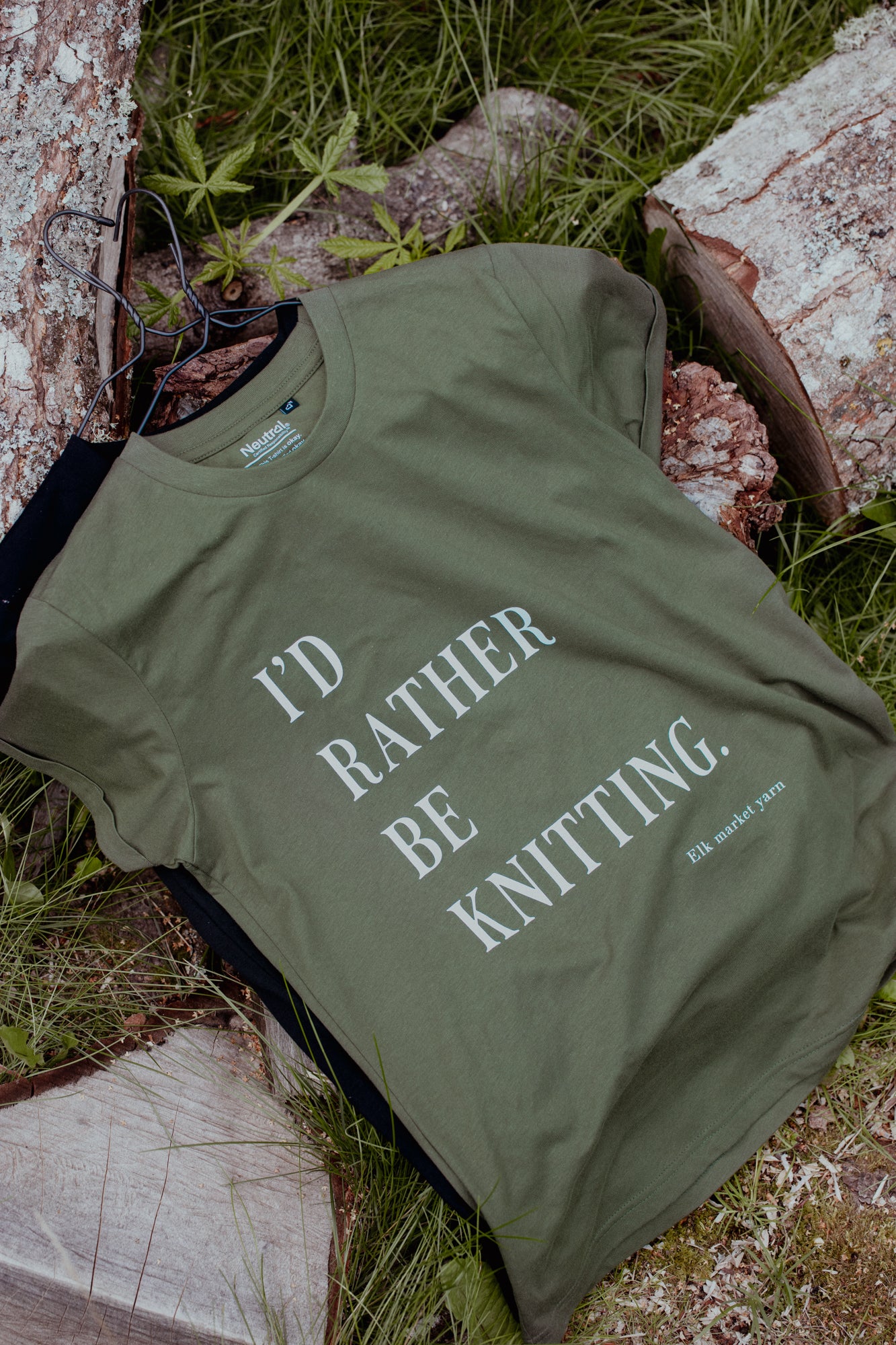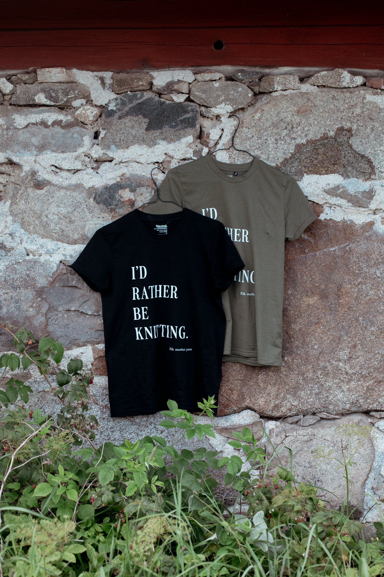 This screen-printed t-shirt will definitely turn som heads! With a straight fit, rolled up sleeve and the message I'D RATHER BE KNITTING, they're the perfect uniform for every knitter. Available in Black and Olive.