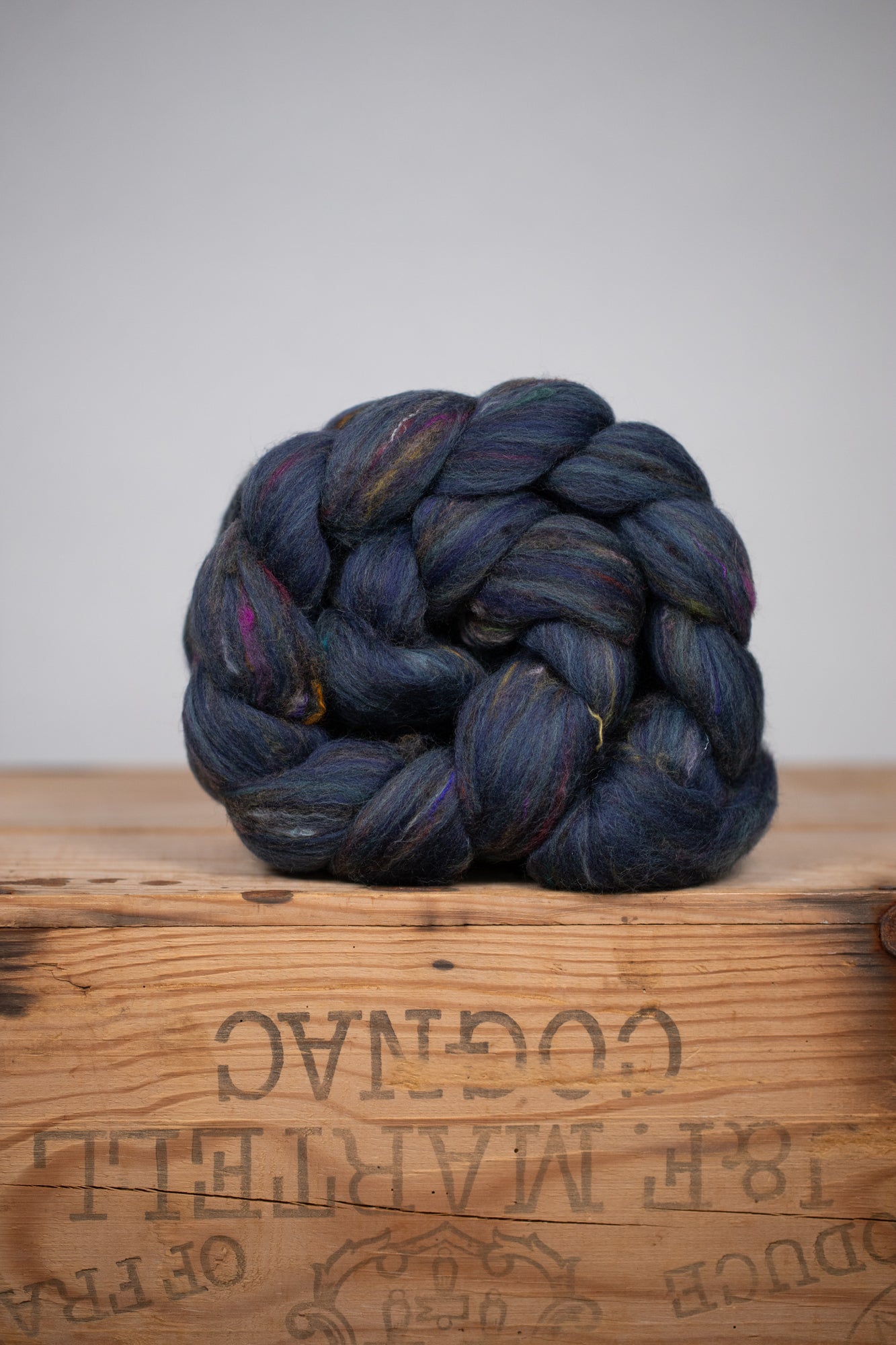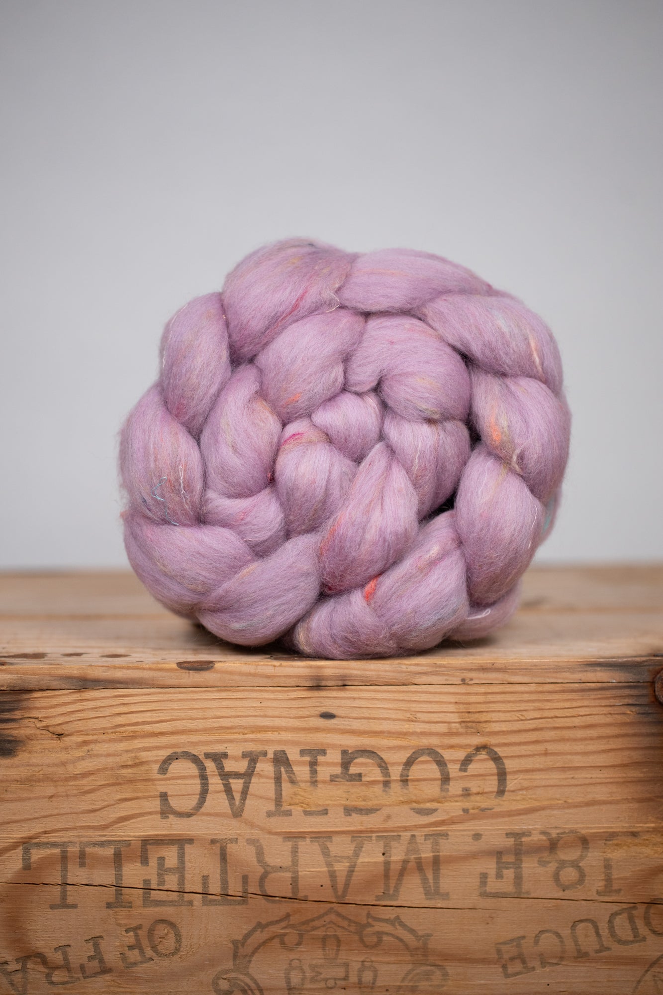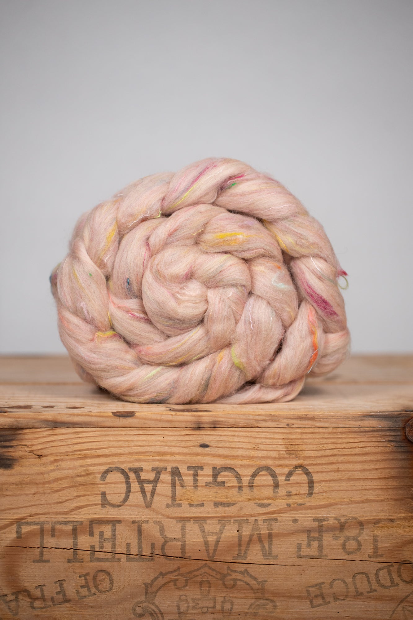 La Bien Aimée Confetti Fiber is the fiber of La Bien Aimée's Confetti yarn before it is spun. It contains 50% 18.5 micron Merino wool, 30% Shetland wool, and 20% recycled LBA threads. Those recycled threads are what give Confetti yarn its pops of color. This fiber makes spinning tweed yarn easy because the recycled threads are already combed into the top. No preparation required!