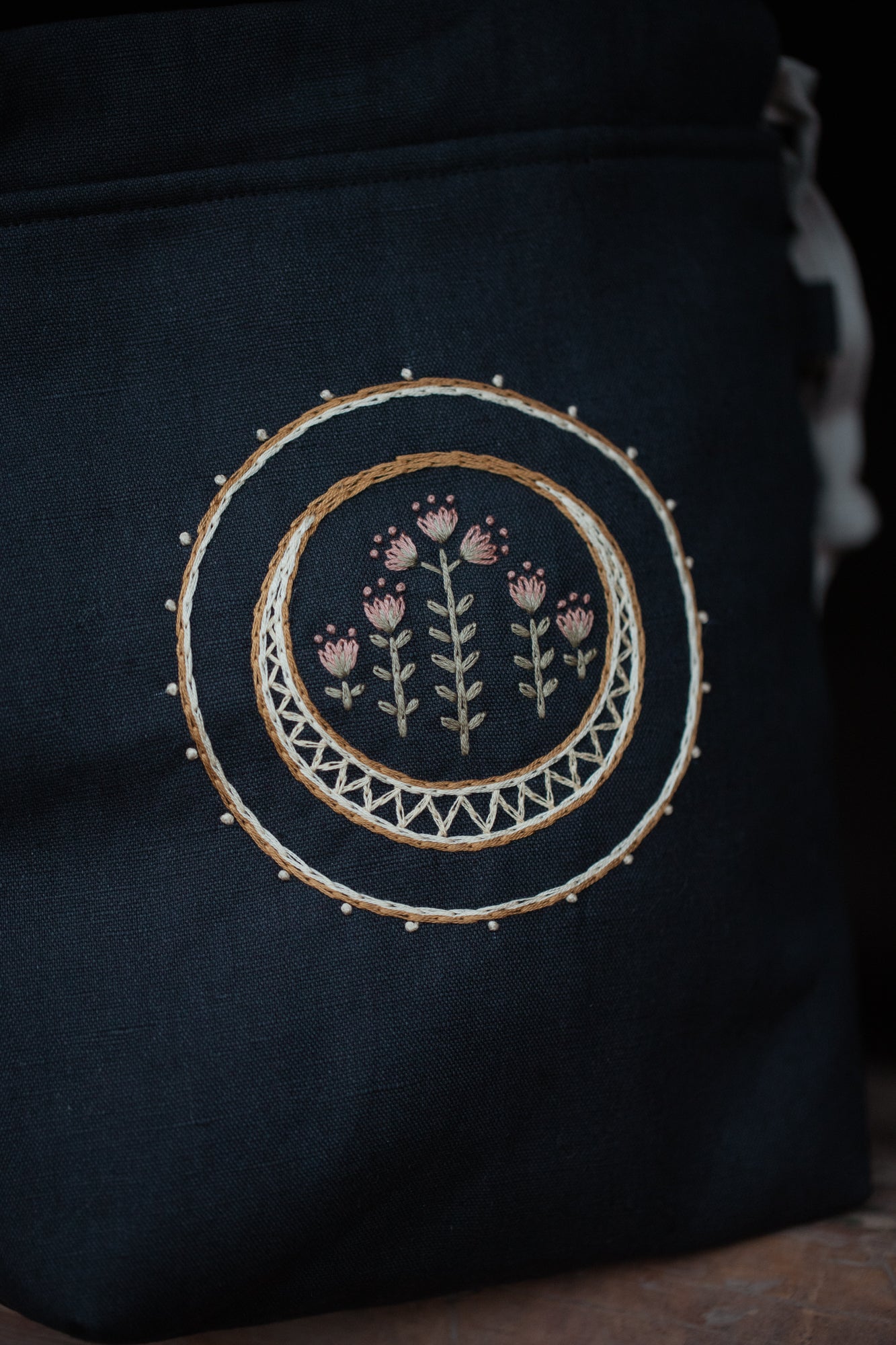 These beautiful project bags are hand embroidered by Milda of @pajauta_makes, maker and designer from Vilnius, Lithuania. The embroidered designs are intricate and beautiful, with inspiration from traditional Baltic motifs. The classic bag has a regular drawstring closure and is fully lined with natural fabric, while the pouch has an open drawstring construction. The small bags have two interior pockets for storing your crafting tools and accessories. The pouches have no interior pockets. All bags are fully lined.