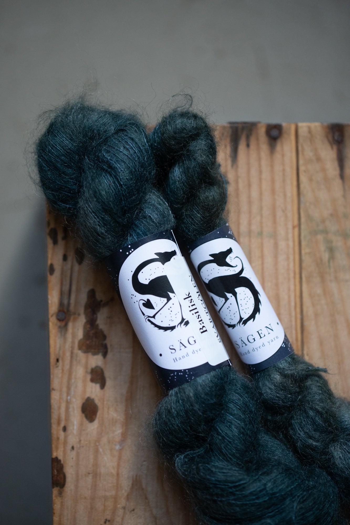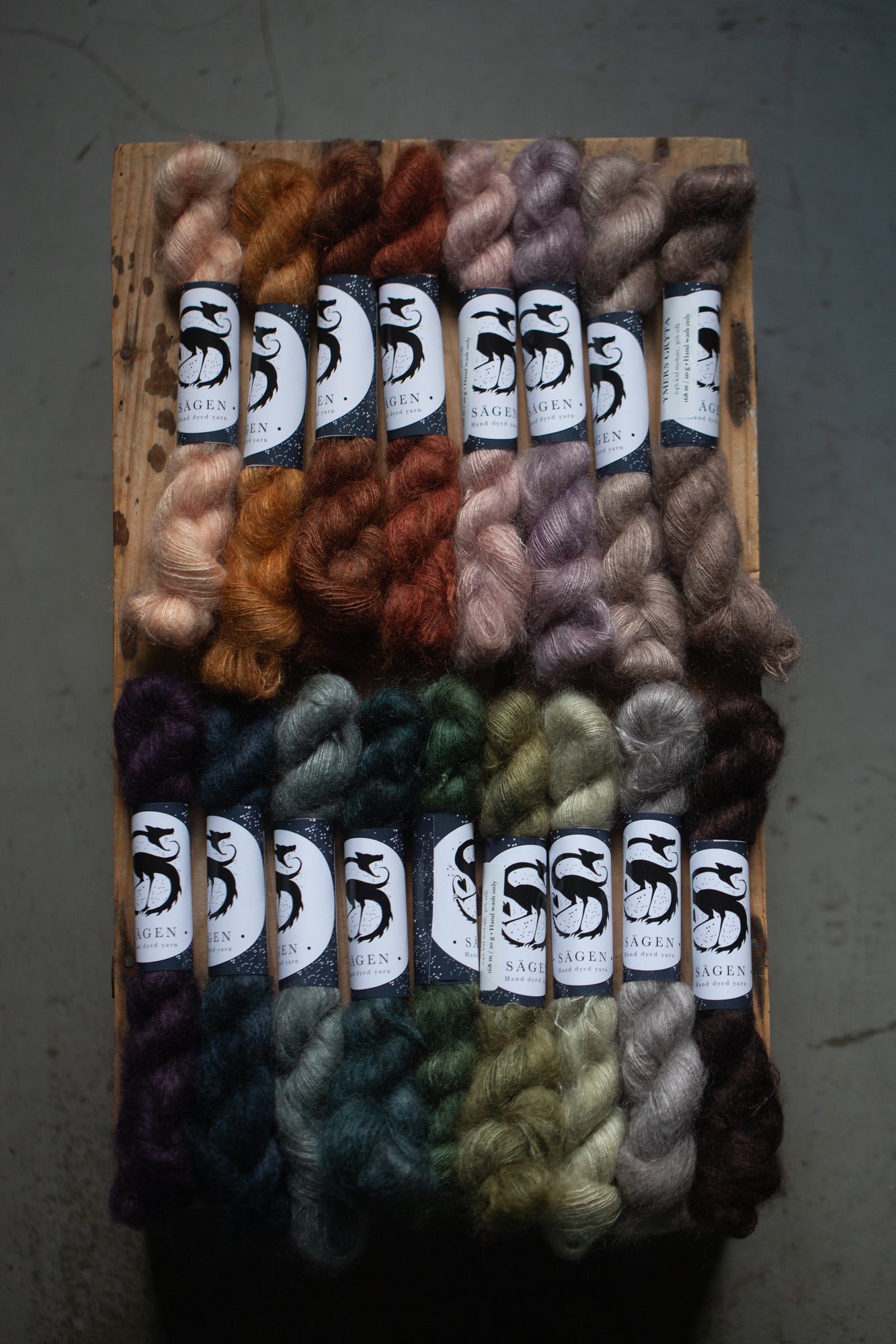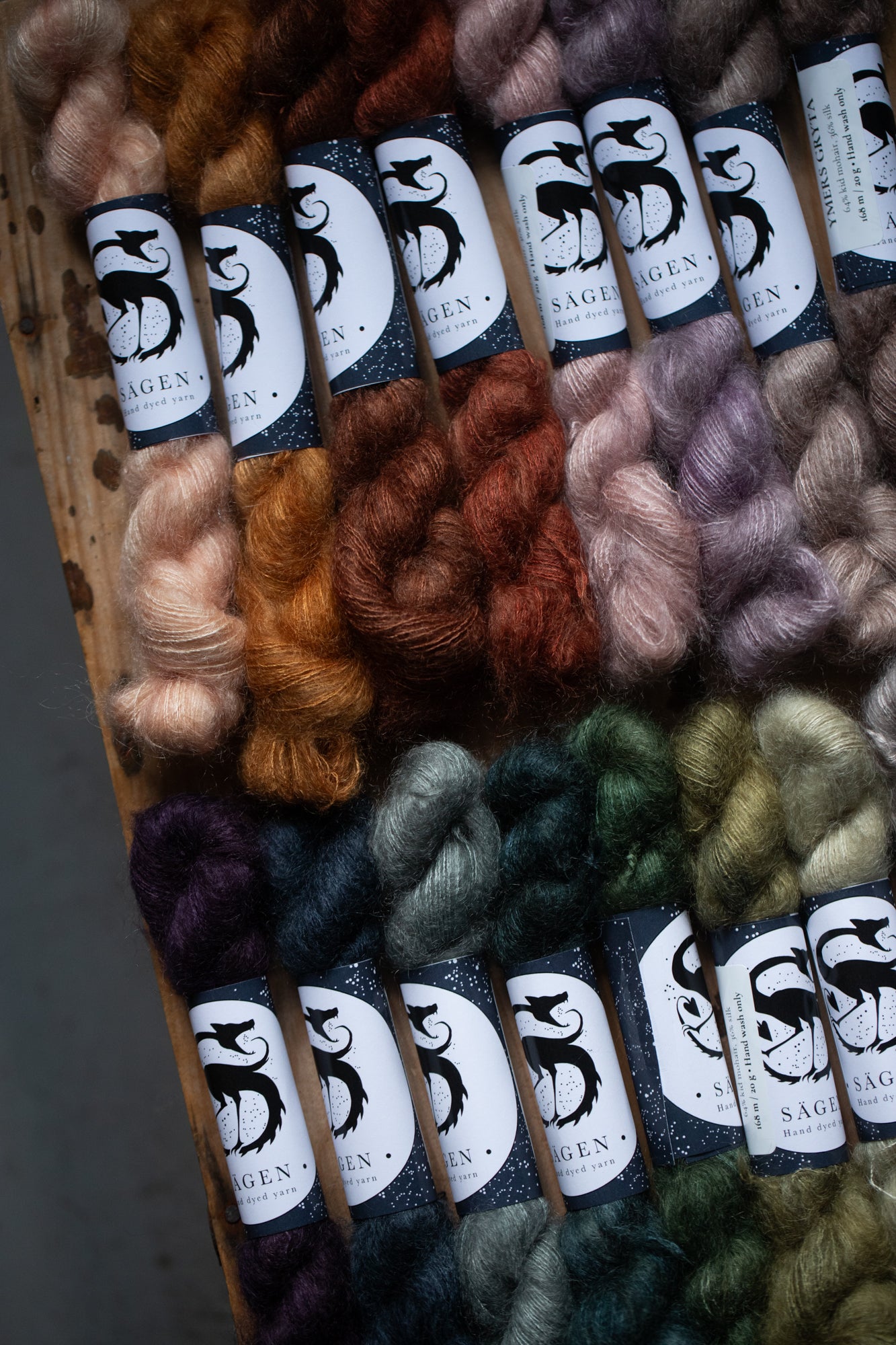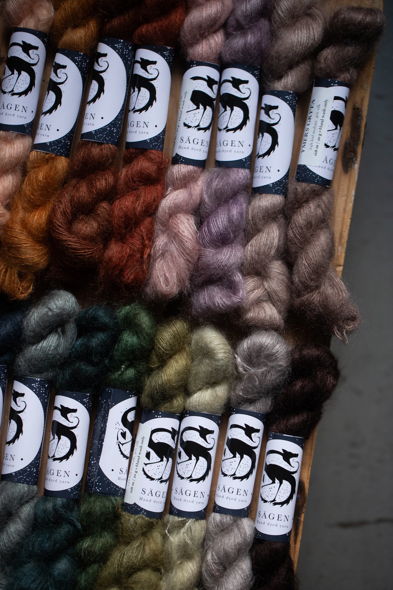 All yarns from Sägen are hand dyed by Lotta H Löthgren, using high quality acid dyes. The colourways are named after creatures, entities, details or ideas from folklore and old stories, and Sägen is the Swedish word for a certain kind of folk story. My aim is to create a palette of colours that are just as beautiful on their own as they are to combine, and that knitters and makers can return to over the years.