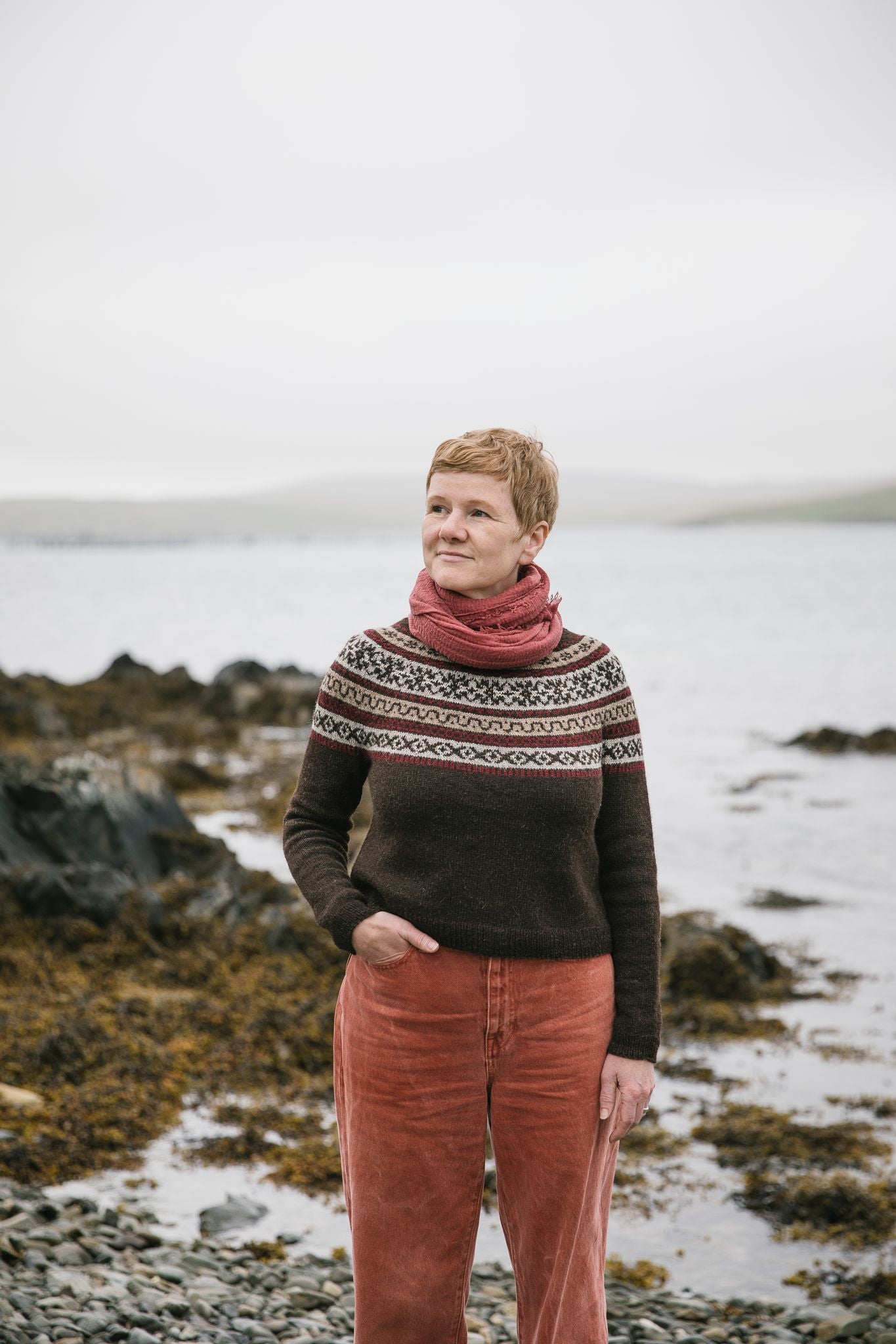 Gudrun Johnston is a Shetland-born knitwear designer currently based in Massachusetts. She is known for accessible modern-day patterns that are greatly inspired by her heritage. She frequently returns to Shetland, where she loves spending time with her family on the Westside.